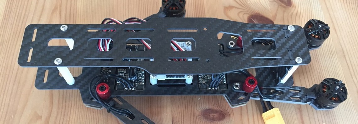 Her vises et eksempel på monteringsplate for 2 Pixhawker montert ved siden av hverandre uten plasthus. Plata har områder for feste med …
